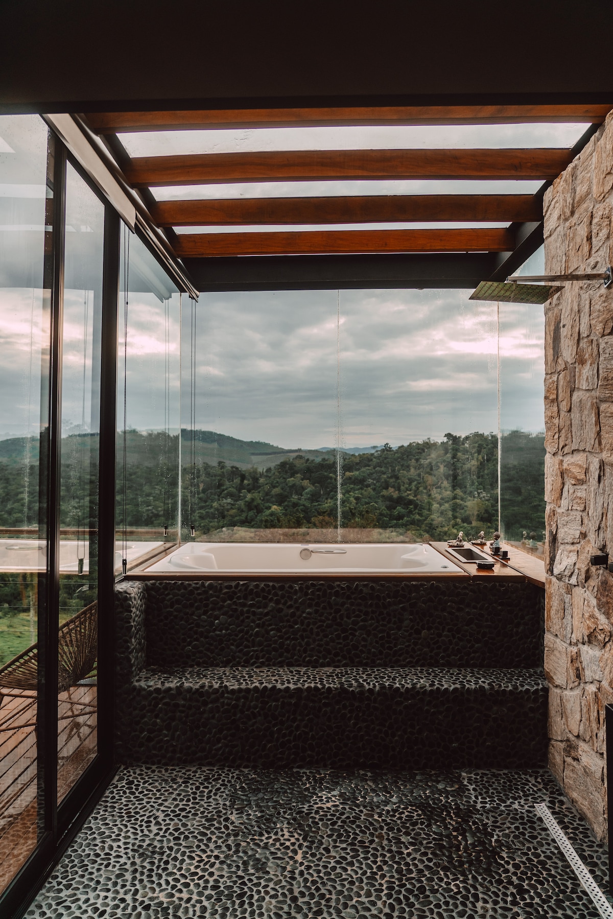 Cabana Nativa es uno de los alojamientos exclusivos de Alto da Galícia (@altodagalicia), ubicado en la región de Atibaia, entre Bom Jesus dos Perdões y Nazaré Paulista. Una casa de campo encantadora y sofisticada rodeada de naturaleza y con una vista increíble a las montañas. Con arquitectura moderna y elementos naturales. El baño revestido de piedra, la chimenea suspendida y los cómodos sillones crean el entorno perfecto para momentos de descanso y conexión.