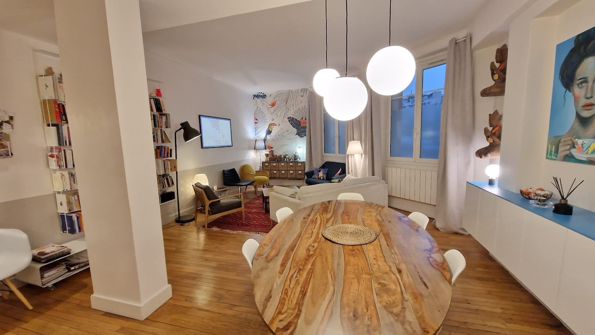 ¡Hola! Si quieres alojarte en el corazón de París en un lugar decorado con amor, ¡este es tu lugar! Tendrás toda la planta superior de este hermoso edificio de 1870 en el Barrio Latino, a un tiro de piedra de Notre-Dame. Cuenta con 2 dormitorios, 1 con cama tamaño king y 1 doble con balcones y escritorios en cada dormitorio (planta superior con ascensor). 1 baño y aseo, cocina totalmente equipada y, por supuesto, una sala de estar. Podrás visitar la ciudad a pie, ya que el alojamiento está justo en el Barrio Latino. Wifi de 900 Mbps.