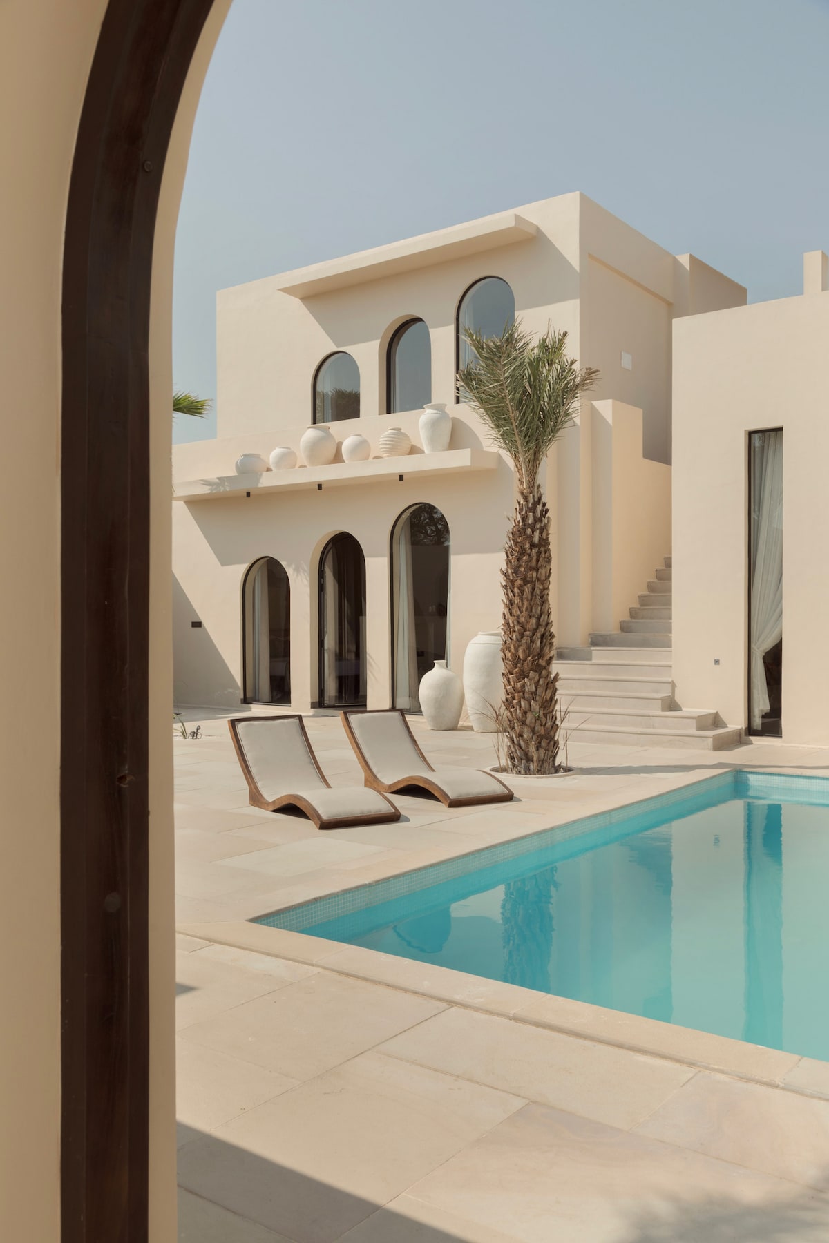 ◆Ubicada en la Ciudad Rosa, esta impresionante villa de 3 dormitorios ofrece un refugio sereno en medio de las colinas de Aravalli. ◆La pileta curva está junto a una pileta circular más pequeña, con iluminación ambiental y sillas de madera. ◆Un bar elegante con sillas de ratán de respaldo alto e iluminación vintage eleva el ambiente al aire libre. ◆Cada dormitorio tiene tonos tierra, ventiladores con hojas, aire acondicionado central y baño privado, uno con bañera. Las ◆dos habitaciones del primer piso tienen balcones privados con vistas panorámicas.