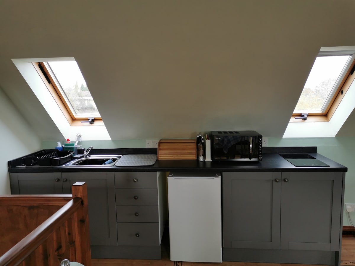 Sala de estar en la planta baja, comedor de la cocina, una estufa de leña para relajarse junto al fuego, solo para uso en invierno. Cocina: armarios a medida, encimera de granito con cocina eléctrica Aga. Una mesa de comedor a medida en un salón comedor de estilo abierto. Escalera de roble hasta el rellano del primer piso, dormitorio principal con cama tamaño king, cabecero acolchado de terciopelo, una gran ventana redonda con vistas increíbles, verdadero lujo. Un baño contemporáneo separado, con ducha sobre bañera, lavabo, inodoro y toallero eléctrico.