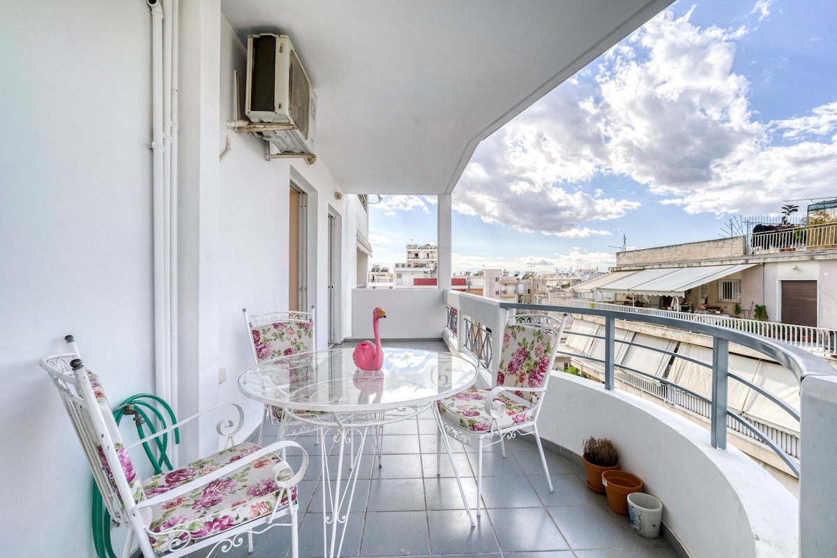Modern penthouse with two balconies, including a stunning 60m² terrace offering Athens views from sunrise to sunset. Just 4 minute walk from Line-1 Metro at Heraklion central plaza and steps from bakery, pharmacy, butcher, fruit and mini market, and playgrounds. Green and safe neighborhood near the Olympic Stadium and top hospitals (Hygeia, Iaso, Iatriko, etc.). Enjoy free private parking, Wi-Fi fiber, 65” & 32” smart TVs, full kitchen, washing machine, and all essentials for a comfortable stay.