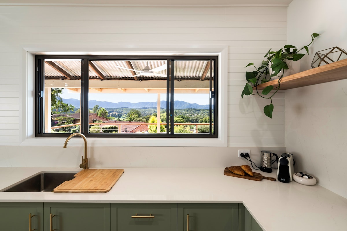 Escape the world! A serene, peaceful, luxurious, private experience for couples in the peaceful and divine haven of the Promised Land, just outside quirky Bellingen. Views over Gondwana Land. Awake to the birdsong. 5 minutes to Never Never river swim holes. Fully airconditioned, serene candle lit outdoor bath, rain shower, fire pit and internal fire place (winter use only), dishwasher, BBQ, HD television, Netflix, Starlink unlimited internet, home made bread. Solitude! Indulge!