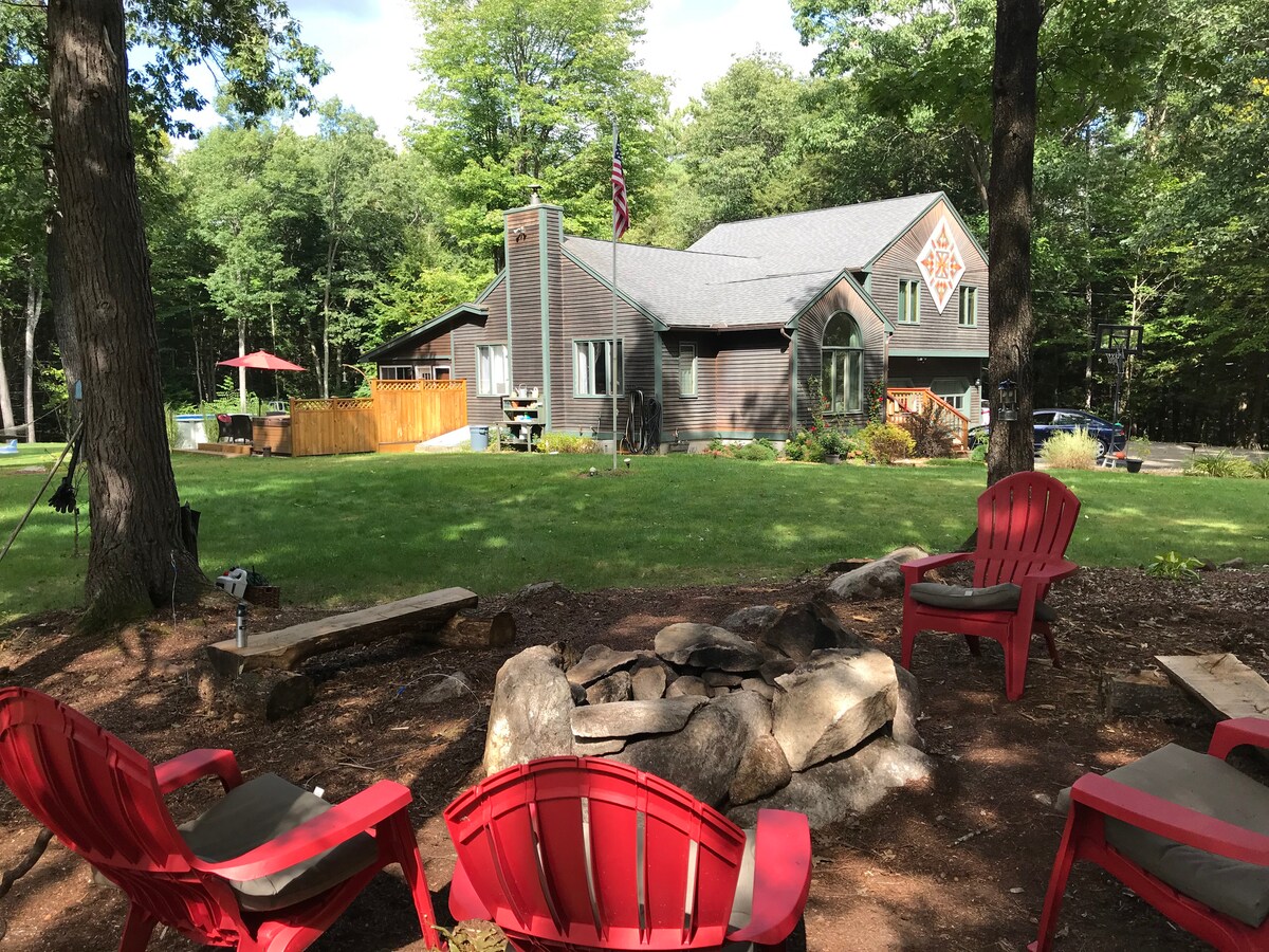 #BarnQuiltHouse Acogedora suite de invitados privada con jacuzzi en las colinas boscosas de una pintoresca ciudad agrícola de New Hampshire. Barrio residencial, céntrico en el sur de New Hampshire. A 20 minutos de Concord, el aeropuerto de Manchester, St. Anselms College, New England College, Pat 's Peak, Crotched Mountain. Dirigite hacia el norte hasta la región de los lagos, hacia el oeste hasta el monte Sunapee, o al sur para visitar Boston... todo a una hora y media en auto. Que la paz de la naturaleza te acompañe.