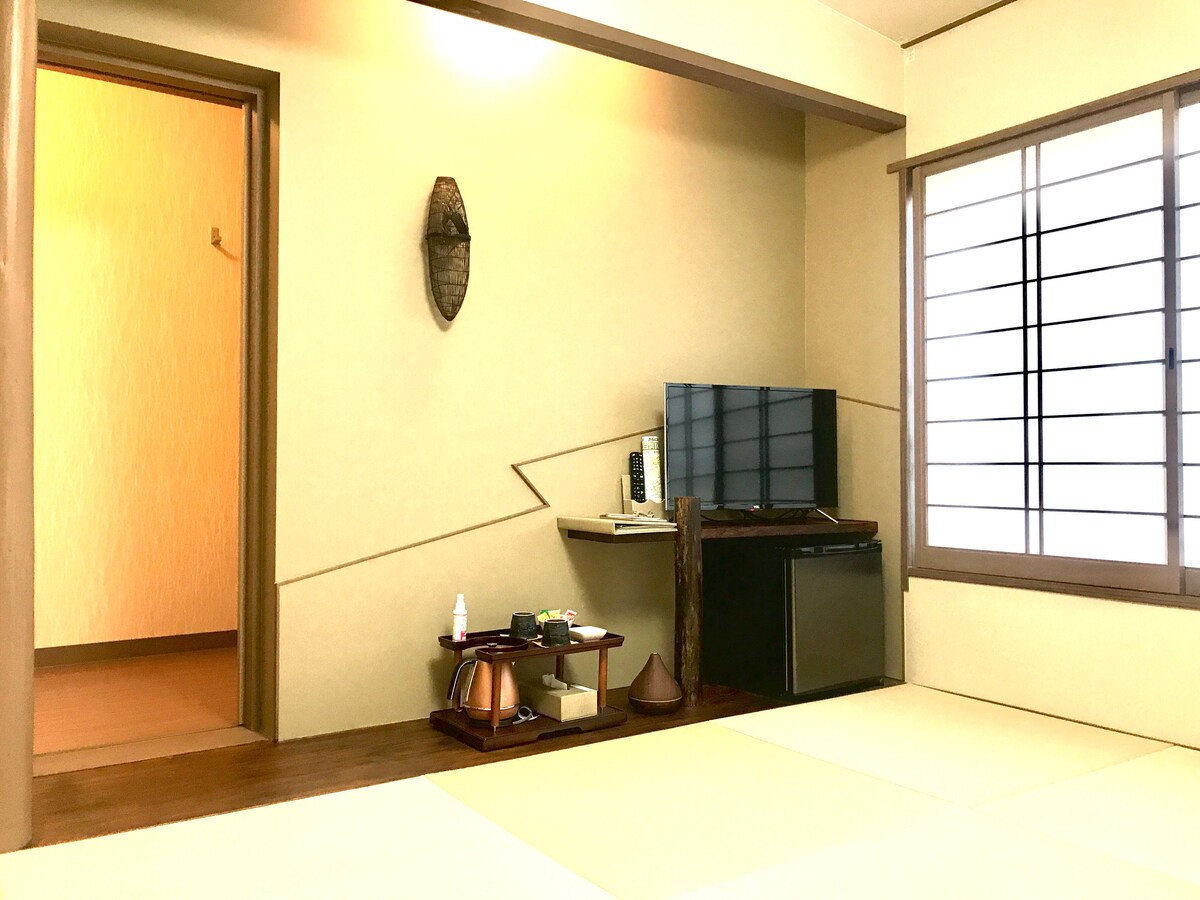 和室8帖 シャワールーム付 お部屋は清潔感があり、無料駐車場もあります。 周辺には外湯めぐりの白良湯や足湯があり、飲食店が並ぶ銀座通り、スーパー、コンビニも近く大変便利な立地です。 南紀白浜ICから車で約10分、 南紀白浜空港から車で約6分、 JR白浜駅から車で約10分、 アドベンチャーワールドまで、車で15分 と、その他白浜の名所にも車で20分圏内に移動可能となっており、 アクセスしやすい恵まれた立地にあります。