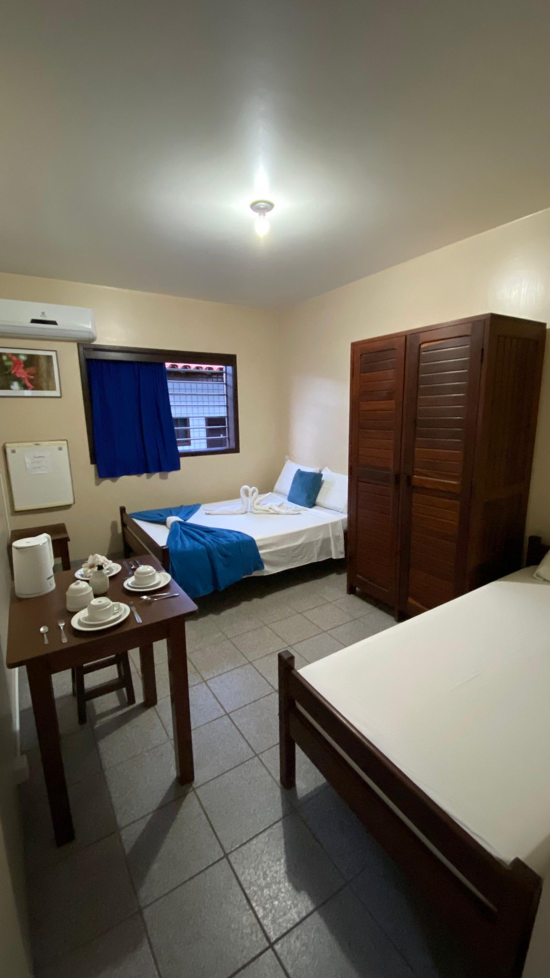 As suítes possuem 1 cama casal e 1 cama solteiro, podendo adicionar mais uma cama de solteiro. Suites completas com entrada individual, ar condicionado e frigobar.