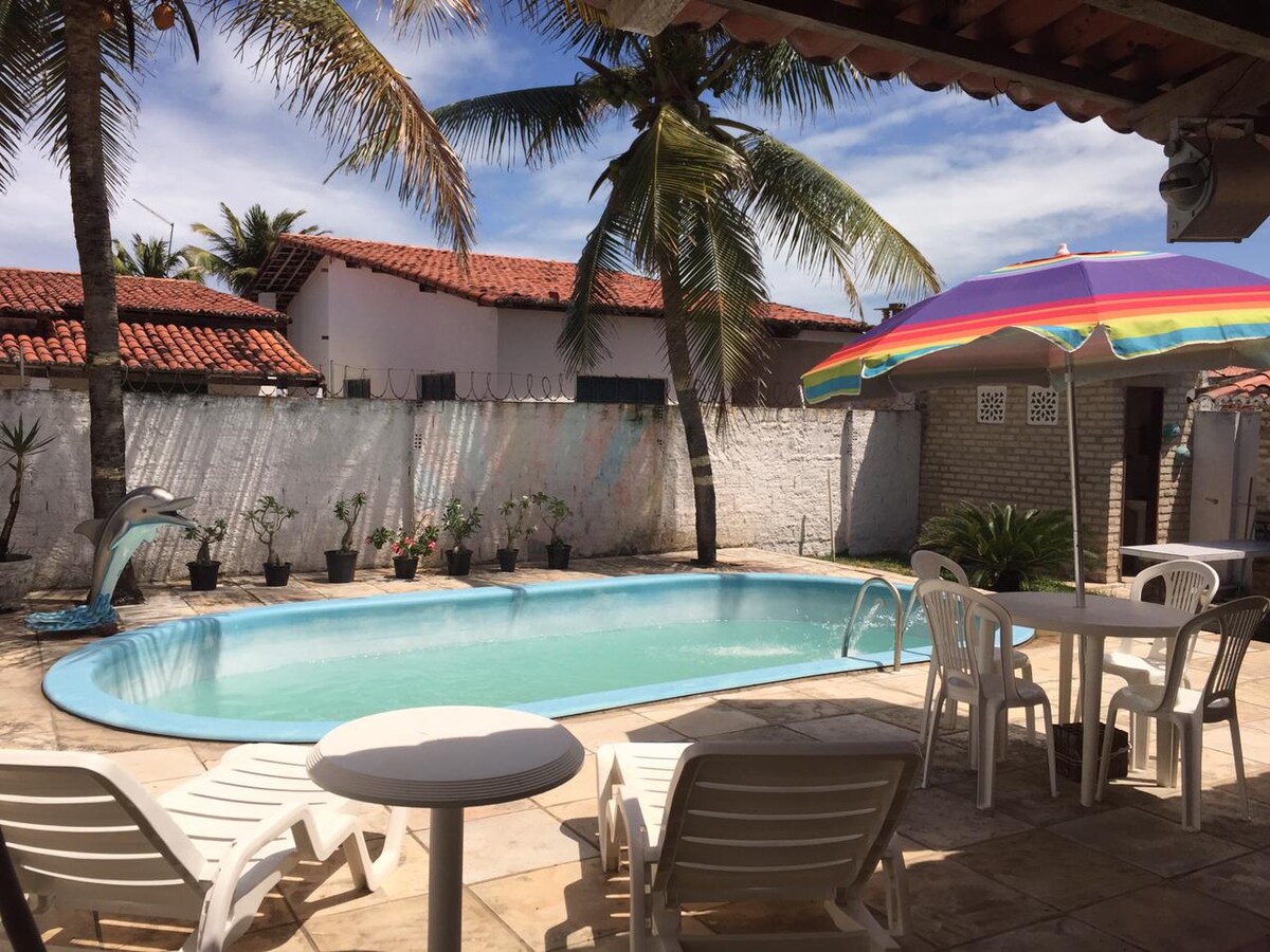 Se trata de una casa de verano ubicada a una cuadra de la playa, muy cerca de la Pousada das Tartarugas y la Casa da Tapioca. Edificio rústico con: - 02 habitaciones, 01 suite (incluyendo: almohadas); - 02 baños sociales (01 dentro de la casa y otro junto a la piscina); - Barbacoa; - Piscina; - Cocina (incluyendo: ollas y sartenes, bebedero, estufa, refrigerador dúplex y congelador); - Sala de estar; - Casa rodeada de balcón con hamacas; - Jardín.