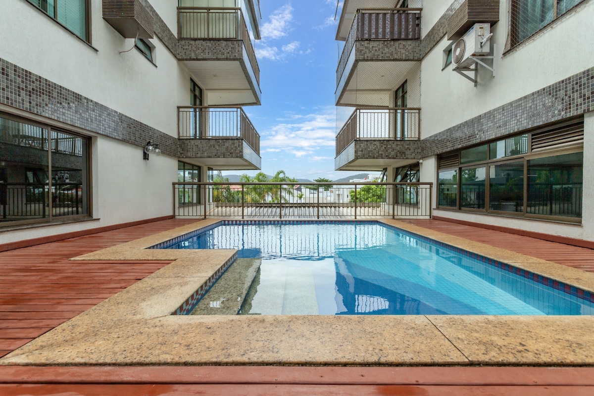 Apartamento compuesto por suite, sala con sofá cama, baño, cocina americana, lavadero y balcón. Acomoda cómodamente a 4 personas, ventilado, condominio de lujo con ocio completo - Foto frente a Praia de Camboinhas, acceso interno a la arena de la playa. Excelente ubicación, barrio tranquilo con facilidades comerciales, seguridad interna del condominio, plaza de garaje. La piscina y otras áreas de ocio están abiertas.