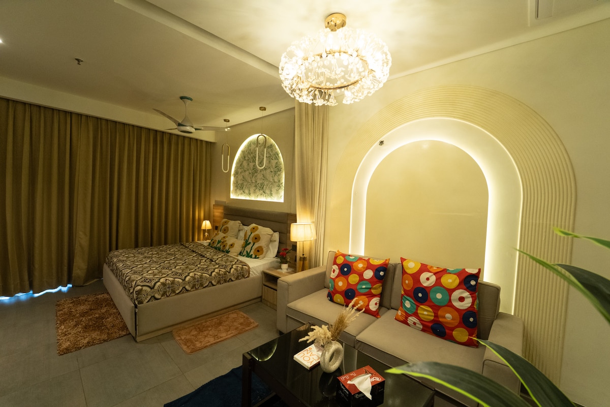 El primer apartamento de 2 Bhk que cumple con todos los requisitos ✨ - 2 dormitorios ( dormitorio principal, segundo dormitorio). - Dos camas tamaño king. - Una amplia sala de estar con una cómoda disposición de asientos. - 2 baños ( 1 en cada uno de los dormitorios). - Cocina pequeña (con todos los utensilios básicos de cocina disponibles y servicios abastecidos, es el lugar perfecto para preparar tus comidas favoritas) - Una zona de balcón compartido que conecta con el apartamento, que puede ser el espacio perfecto para tus paseos nocturnos. ¡Reserva ahora!