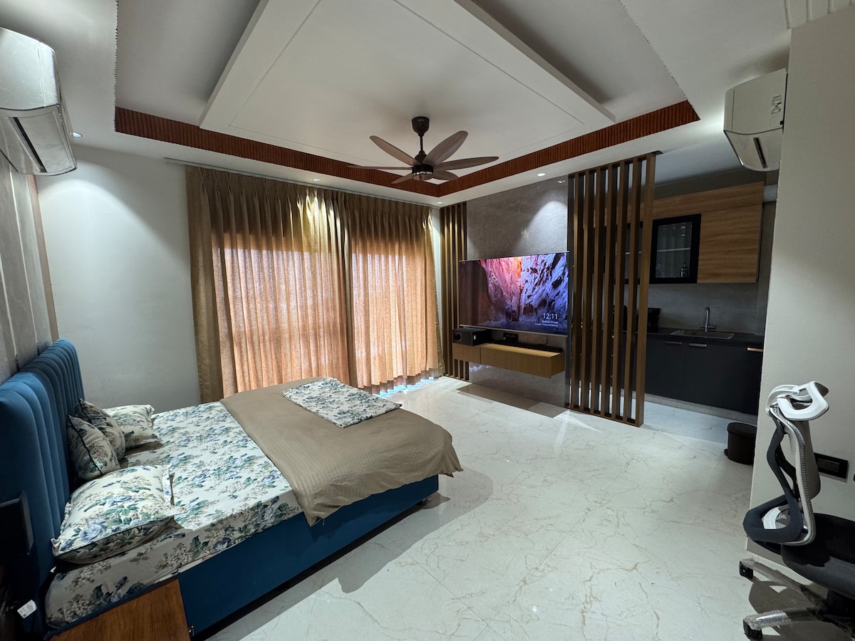 Un estudio totalmente amueblado, elegante y lujoso con una hermosa vista a un paisaje verde y pintoresco durante el día y las luces de la ciudad por la noche. El lugar perfecto para relajarse y desconectar para viajeros de negocios, estudiantes o parejas. Internet de alta velocidad disponible y compatible con el trabajo a distancia. Hay aparcamiento gratuito y seguro disponible en las instalaciones. Estamos ubicados a 5 minutos en coche de Expo Mart, a 8 minutos de Pari Chowk y del centro vacacional Jaypee. Hay comida casera disponible.