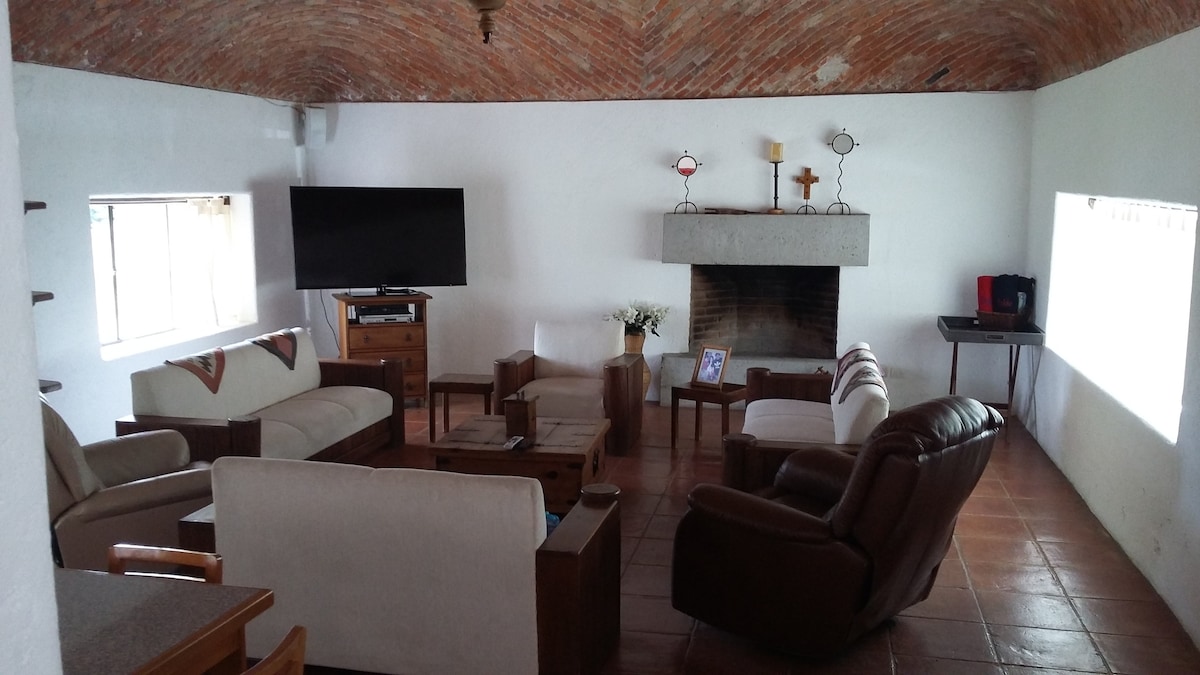 Casa de campo muy amplia, sala con chimenea, Futbolito, Amplio comedor, cocina, 4 habitaciones, 8 camas, 1 sofa-cama, baño completo en cada hab. todo lo que necesitas, asador! estufa, refrigerador, cafetera, vasos, cubiertos, microondas, agua caliente, toallas y sábanas limpias, Y una vista inigualable, ideal para un fin de semana de relajación y disfrute de la naturaleza en familia, cuenta con una terraza equipada con asador y horno de piedra, así como área para fogatas.