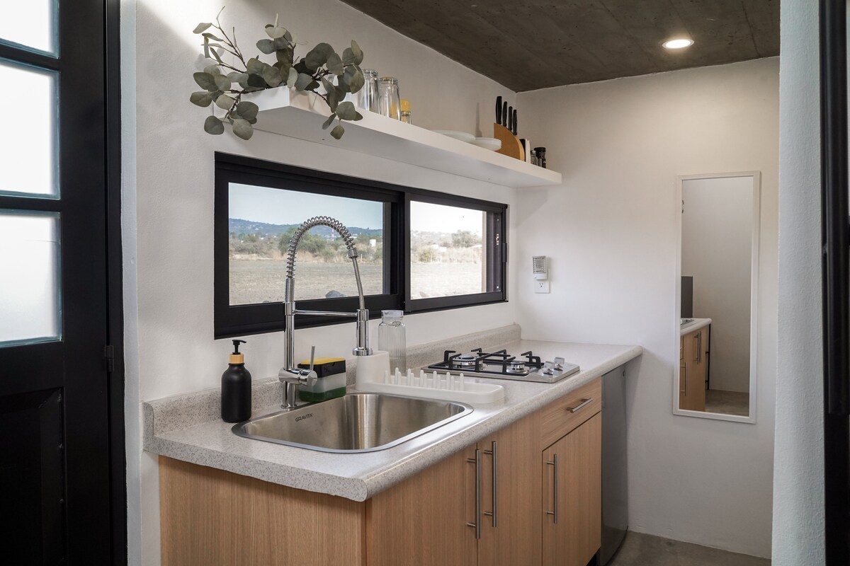 Conecta con la naturaleza en esta escapada inolvidable. A solo 50min. de Querétaro disfruta de CASA MILA, una Tiny House privada de 20 m², ideal para 2 - 4 adultos (Cama matrimonial + sofá cama). Tu reserva incluye: * Cocina equipada * Asador con carbón * Comedor exterior * Área de fogata con leña * 3 hectáreas de terreno para explorar Casa Mila fue diseñada para ofrecerte todo lo necesario en pocos metros cuadrados creando una experiencia única, acogedora y más cercana a la naturaleza.
