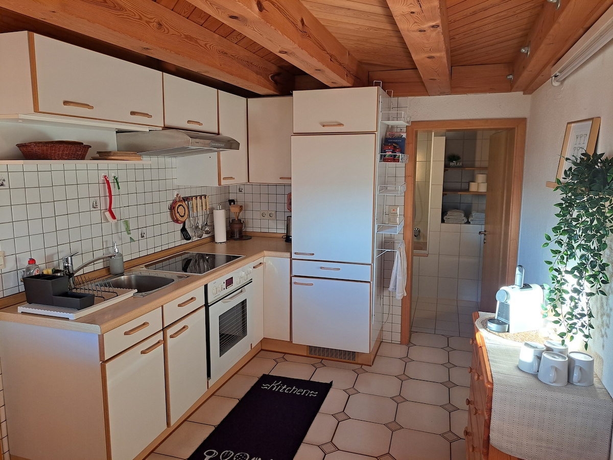 Huge, traditionally furnished apartment in the heart of the Black Forest with an amazing view in the middle of nature. 110 m² (1200 ft²) with a great balcony, including a BBQ grill. The surrounding forest is only 2 minutes away by foot: an idyllic paradise for hikers and mountain bikers with endless trails to discover. The apartment offers a fully equipped kitchen, a spacious bathroom with a wellness tub, a cosy living room and a dining area. The two bedrooms each offer a comfortable double bed.
