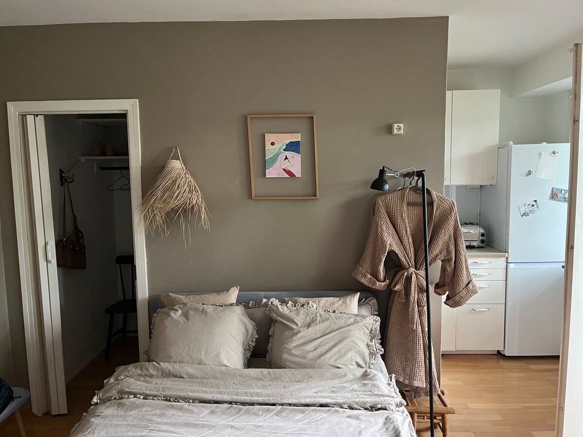 This cute little studio accommodates nicely two guests! The rooms have high ceilings, and there is a beautiful view of the quiet inner courtyard. You will find plenty of restaurants, galleries, and the seaside within a few block, just 15 minutes from the center. The living room, connects to the open kitchen. The 140 cm wide bed sleeps two. The bathroom has a washing machine. Apart from the kitchen and the bathroom, the apartment has been newly renovated. My parents are my co-hosts. Welcome!