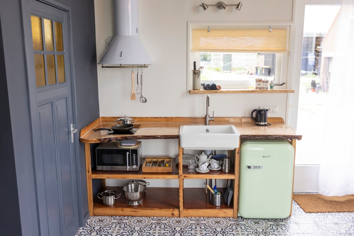 Relájate en nuestro acogedor Beachy. Esta se encuentra en un campo privado en nuestro pequeño camping de granja. Lo único de nuestra caravana es que la puerta trasera se puede abrir y desde su cama (140x200) se puede ver el dique de Wadden. Viene con un edredón de lits-jumeaux de serie. Hay un amplio armario de almacenamiento y en la cocina encontrará una nevera, hervidor de agua y Nespresso. Se proporcionan toallas. Usted utiliza el sanitario general.