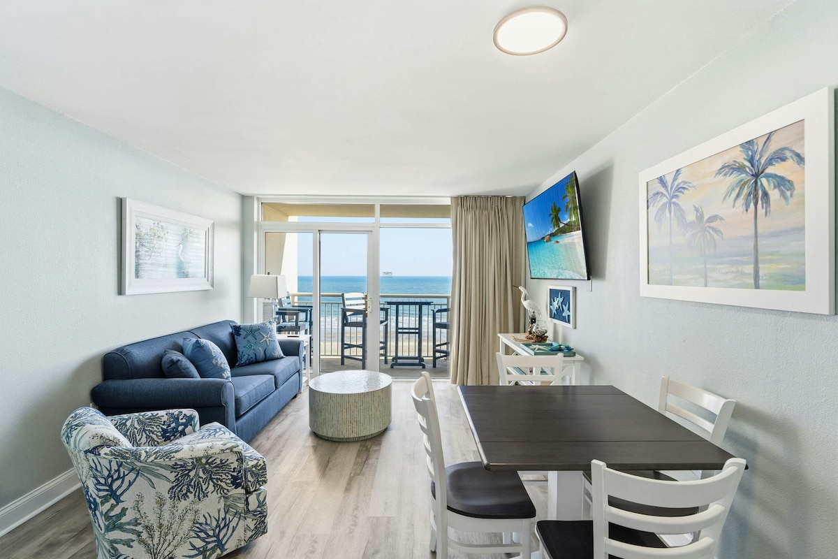 🏝️ Oceanfront 1st-floor condo 🏠 3BR • 2.5BA • Sleeps 8 🛏️ 5 beds (1 king, 2 queens, twin bunkbeds) 🌅 Ocean & pool views 🏊 Pool (seasonal) ⛱️ Beach gear (chairs, umbrella, toys) 🍽️ Full kitchen w/ dishwasher 🫧 Washer & dryer 💻 Free Wi-Fi + workspace 📺 4 Smart TVs + cable 🍹 Wet bar + fun drinkware ⛳️ Championship golf nearby🏌🏼♂️ 🛍️ 1 mile to Main Street • 5 min Cherry Grove • 7 min Barefoot Landing • 25 min Broadway at the Beach 📍North Myrtle Beach, SC