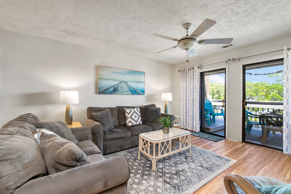 Sin escaleras... Comunidad privada con acceso privado a la vía navegable, con dos piscinas y jacuzzi. Vista limitada, observá los barcos en la vía navegable intercostera desde el condominio. Primer piso, vivienda al final. Decoración blanca de diseño de invierno, sillón reclinable eléctrico y TV inteligente grande. Alojamiento limpiado por el huésped Cocina bien equipada, porche con mosquitero y columpio y a una milla de la playa. Compras en Five Docks y atardeceres espectaculares Para alquilar, tenés que tener 25 años. Un máximo de dos personas, incluidos adultos, niños y bebés. NO SE PUEDE FUMAR en la unidad ni en el exterior, por la asociación DE propietarios.
