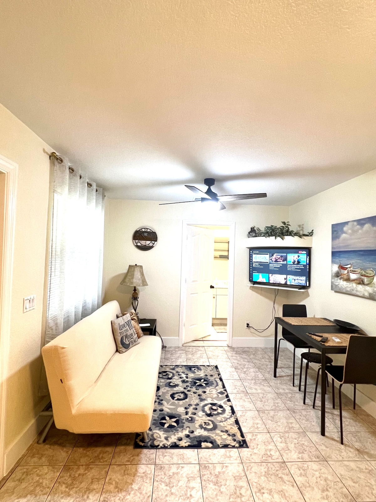 Un estudio recién reformado y totalmente amueblado en una casa, con entrada privada propia, rodeado de un jardín tropical en un barrio seguro y tranquilo. Baño privado con ducha y bañera de gran tamaño, vestidor con cama plegable adicional. La cocina está equipada con una nevera pequeña, microondas, placa eléctrica, cafetera, tetera, tostadora, olla de cocción lenta, platos, ollas y sartenes. En el lanai protegido hay una mesa con sillas donde puedes tomar una taza de café por la mañana temprano con el canto de los pájaros.