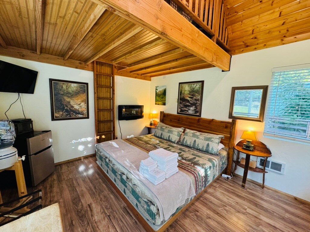 Cabañas rústicas de montaña - ¡Glamping! Nuestras encantadoras cabañas King están perfectamente ubicadas a lo largo del río North Umpqua en el bosque nacional Umpqua. Esta región de las Cascadas de Oregón se conoce comúnmente como «la puerta de entrada a la joya esmeralda de Oregón» hacia el lago Crater. Estamos ubicados en el centro del sendero North Umpqua Trail, con fácil acceso en coche a muchos senderos, cascadas y las aguas termales de Umpqua. Las cabañas King tienen una cama tamaño king y un loft con cama doble. La casa de baño/ducha compartida está a pocos pasos de las cabañas.