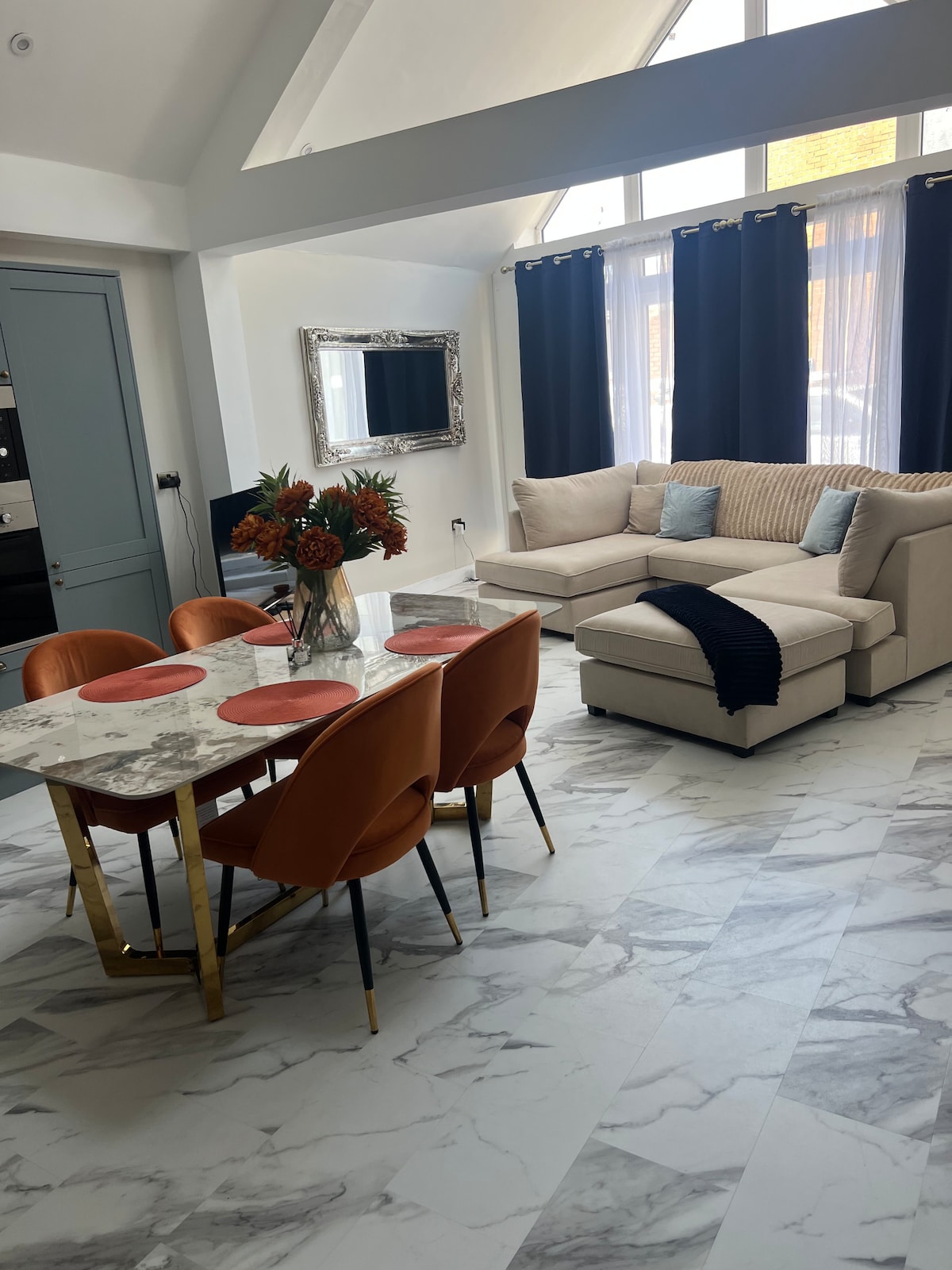Un apartamento moderno y lujosamente amueblado en la planta baja en el frondoso barrio de Roundhay, en Leeds, con capacidad para 4 personas. Incluye una gran sala de estar/cocina de planta abierta (que incluye un cine en casa) que conduce a una suite de invitados independiente que consta de un dormitorio y un baño de tamaño considerable. A 10 minutos a pie del parque Roundhay, a 5 minutos de los servicios de Street Lane y de las rutas regulares de autobús al centro de la ciudad de Leeds. El acceso dedicado es a través de una puerta plegable a un gran patio/jardín que los huéspedes pueden utilizar.