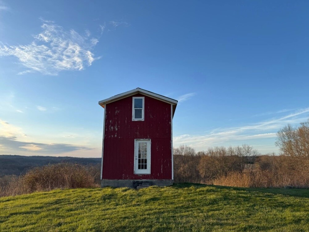 El granero elevado de 8'x12' tiene capacidad para 2 personas en 2 catres (cada catre soporta 300 libras). Trae tu propia ropa de cama, almohadas, agua y suministros. Hay un escalón hasta el suelo acolchado, 2 ventanas con cortinas y una cerradura interior. 2 lofts superiores almacenarán todo tu equipo. Se incluye una mesa de pícnic, anillo de fuego y rejilla, 4 palos de cocina, espátula, ventilador/luz pequeño y una gran vista al estanque de pesca. Hay un baño portátil limpio a poca distancia a pie. Por favor, haz el registro antes del anochecer para que puedas ver claramente el camino de entrada.