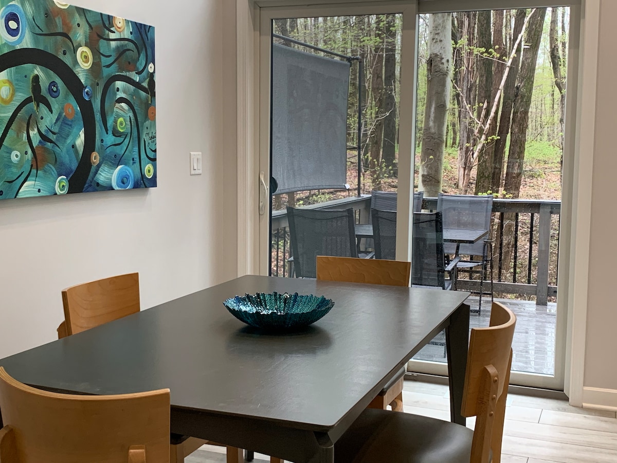 We look forward to welcoming you to the secluded beauty of our space, designed and built by my husband on our 20 acres of wooded property in the rolling hills of Central Ohio. A floor-to-ceiling glass front provides you with a view of fields green in summertime and ripe with goldenrod in the fall, four outdoor deck spaces invite you to relax in the beauty of nature, and a second story loft suite with a soaking tub are ready to provide you with rest and refreshment.