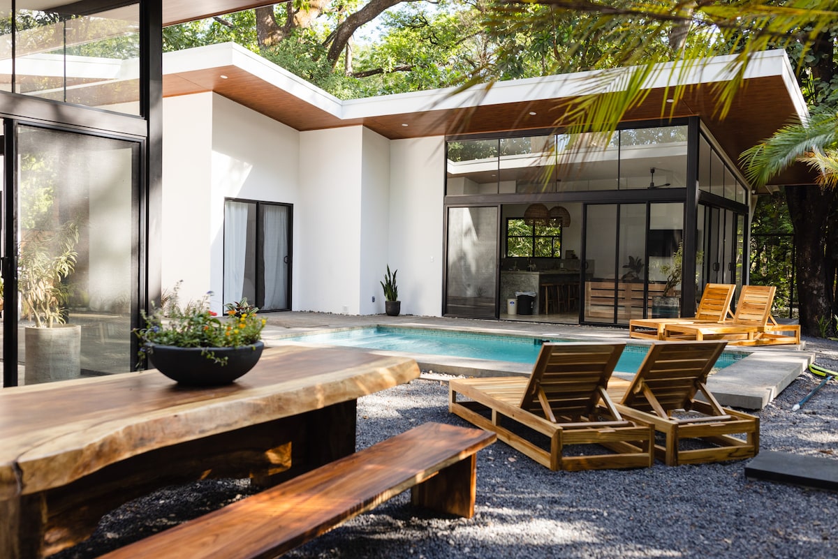 Thoughtfully designed, this elevated and high ceiling house offer all the comfort and convenience needed for both short and extended stays. - Loft bedroom with queen-size bed - Living room, sofa bed (medium) - Spacious and sunlit - Desk - Bathroom w/ rain shower - AC, ceiling fans - 100mb Wi-Fi - Safe box - Fully equipped kitchen (stove, fridge, microwave, coffee maker, more. - Covered terrace - Large sliding glass doors (w/ screens) - Laundry - Pool - Outdoor shower - Private & secure parking