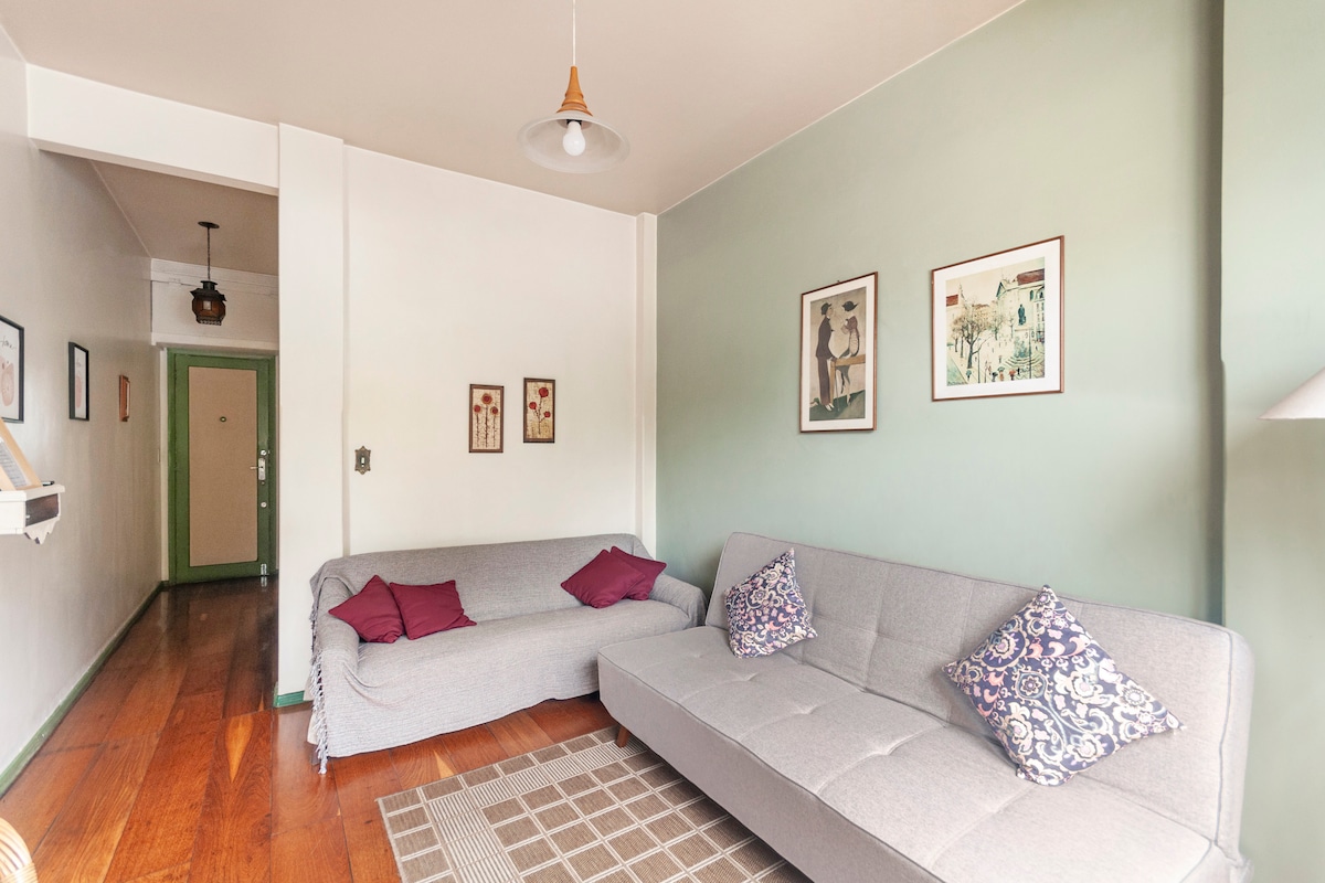Cómodo departamento, con una ubicación privilegiada: a pocos pasos del teleférico, tiendas y varios comercios, ¡todo a tu puerta! El espacio tiene • 1 dormitorio con una cama matrimonial y un armario. • Ropa de cama, toallas y mantas incluidas • Habitación con sofá cama, sofá adicional y dos sillas • 2 ventiladores de columna portátiles • Televisión inteligente y wifi • 1 WC. • Cocina con microondas, sándwichera, cafetera y utensilios básicos. • Edificio con ascensor, unos pocos escalones en la entrada Sin garaje