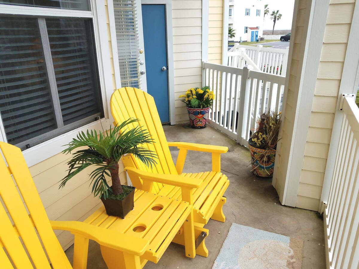 Welcome to the “Blue Gull!” You will find everything you need for a perfect beach getaway in this cozy 1 bedroom condo! We are perched on the 3rd floor and with that comes tall ceilings, a balcony with a view of Lake Padre, and a peaceful quietness. While the condo is within walking distance to the beach (5 minutes), you can also have a vacation without leaving the complex. The community offers many other amenities...hot tub, heated pool, sauna, fitness center, etc. What’s not to love?!?!!!