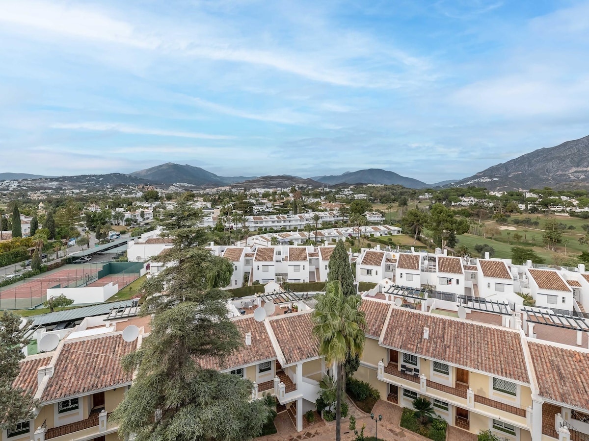 Wake up to blue skies and breathtaking sea views from your private rooftop 🌊. Enjoy golden sunsets, a glass of wine, or sunbathe in privacy. This bright apartment in Pueblo Paraiso is just 12 min from Marbella’s beaches, golf and Old Town. Fast Wi-Fi, comfy beds, equipped kitchen, infinity pool, and rooftop for stargazing or sunset dinners. Perfect for couples, families or remote work. Kid-friendly with playground access nearby