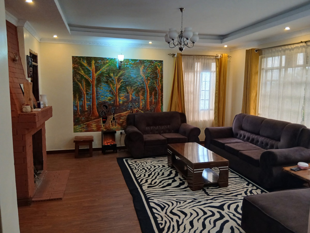 A solo 10 minutos de la ciudad de Naivasha, escondida en una pequeña colina. 3 dormitorios separados 2 en la planta baja y 1 dormitorio en la planta superior de acceso exterior. Las 2 pequeñas habitaciones de la planta baja tienen su propia zona de estar,mini refrigerador, pequeño inodoro y ducha. Pequeña área de oficina en uno de los dormitorios pequeños, tiene un porche muy grande con área de barbacoa, parrilla y área de descanso. La 1 habitación de arriba tiene su propio pequeño paseo cerca, porche, gran sala de estar con una cocina de planta abierta y una chimenea,despensa, bañera, inodoro y ducha de cubículos.