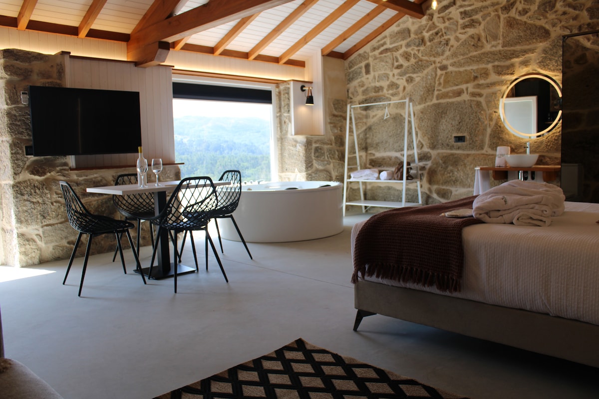 Relájate y desconecta en este alojamiento tranquilo y elegante. Apartamento de más de 30 m2, con un amplio ventanal que sería como un cuadro de la naturaleza que podrás disfrutar desde la propia cama o el jacuzzi. Dispone de WiFi y Smart TV de 50''. Este apartamento es muy cuadrado y amplio, con mucha luminosidad, lo que lo hace único.