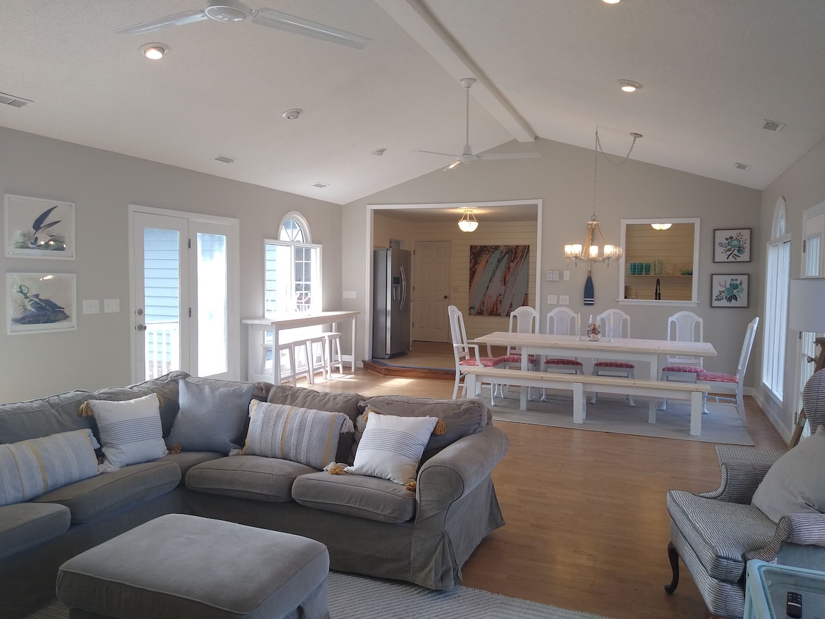 Adorable estudio de invitados en el primer piso con techos altos y decoración acogedora y luminosa. Entrada privada con entrada privada. A 2 minutos a pie de la playa con acceso directo a la playa al final de la carretera. La cocina tiene nevera completa, microondas, horno tostador, placa calefactora de 2 quemadores, cafetera, licuadora, platos, ollas, sartenes y utensilios. Lavadora y secadora dentro del alojamiento. Se proporciona cable y wifi. La sala de estar tiene un sofá de tamaño completo y una mesa de hojas para cenar o trabajar con computadoras portátiles. Se aceptan perros pequeños entrenados (2 como máximo). Tarifa de $125
