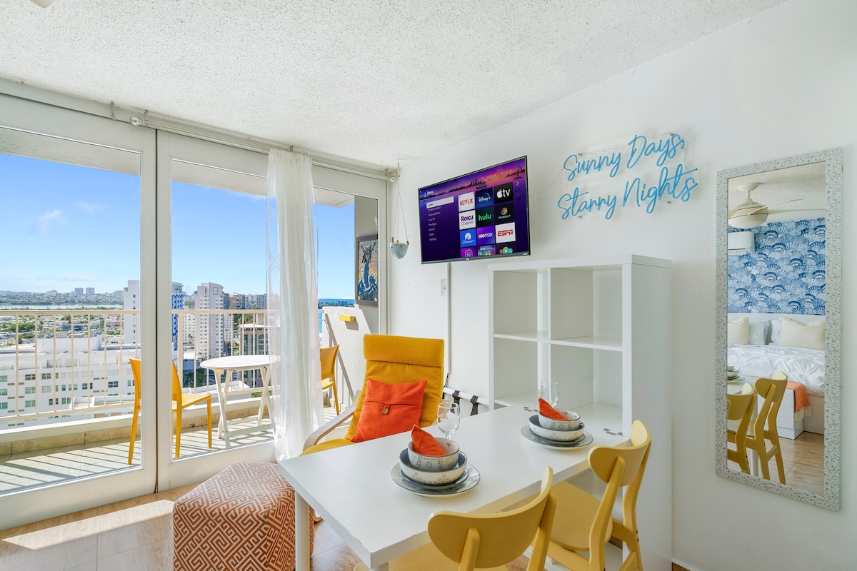 Panoramic Ocean-View Escape with Private Balcony (No Parking) Wake up to breathtaking, panoramic ocean views from your private balcony in this vibrant, sunlit studio. Designed for comfort and connection, this space is perfect for couples, solo travelers, or remote workers. Enjoy a fully equipped kitchen, high-speed WIFI, and the perfect mix of island charm and modern ease — all just steps from city life and the beach.