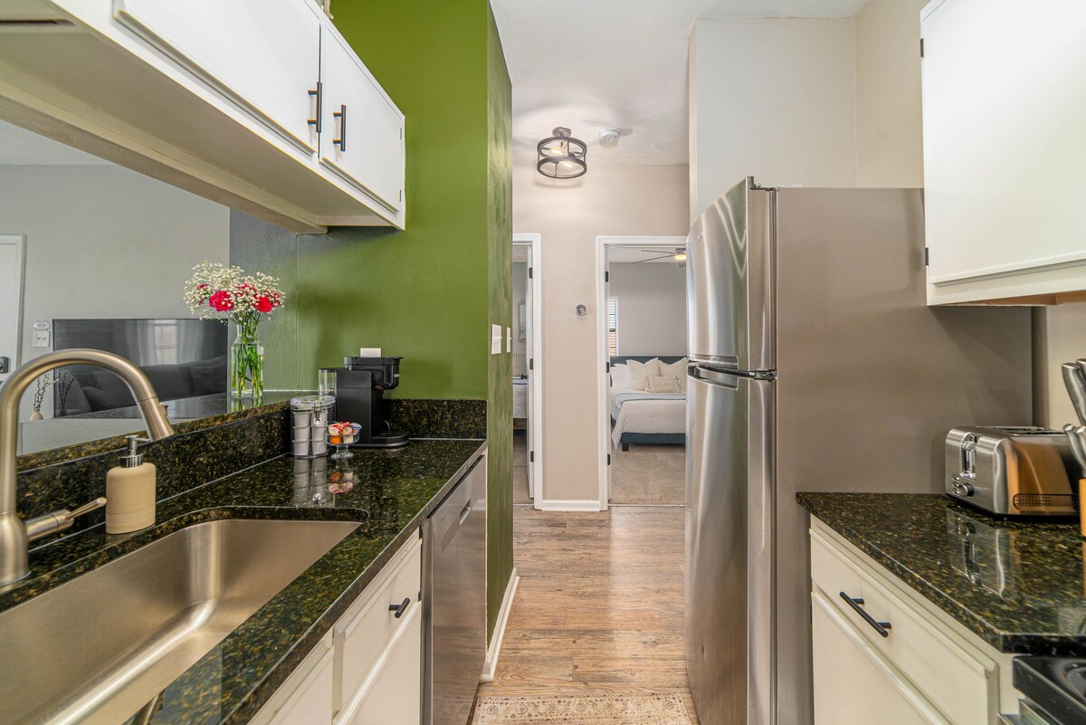Te sentirás cómodo en esta espaciosa suite de un dormitorio. Tienes tu propia cocina, lavadora/secadora y sala de estar con televisores grandes en el dormitorio y la sala de estar. Para relajarte después de tu día, entra en tu gran y hermosa ducha que tiene agua caliente sin fin. Prueba el sofá de la sala de estar que se convierte en una cama para acostarte mientras ves la televisión o para usar como cama supletoria. Entra/sal por una entrada privada. Solo tú tendrás acceso a tu espacio. Limpio y acogedor. ¡Quédate un día o quédate un tiempo!