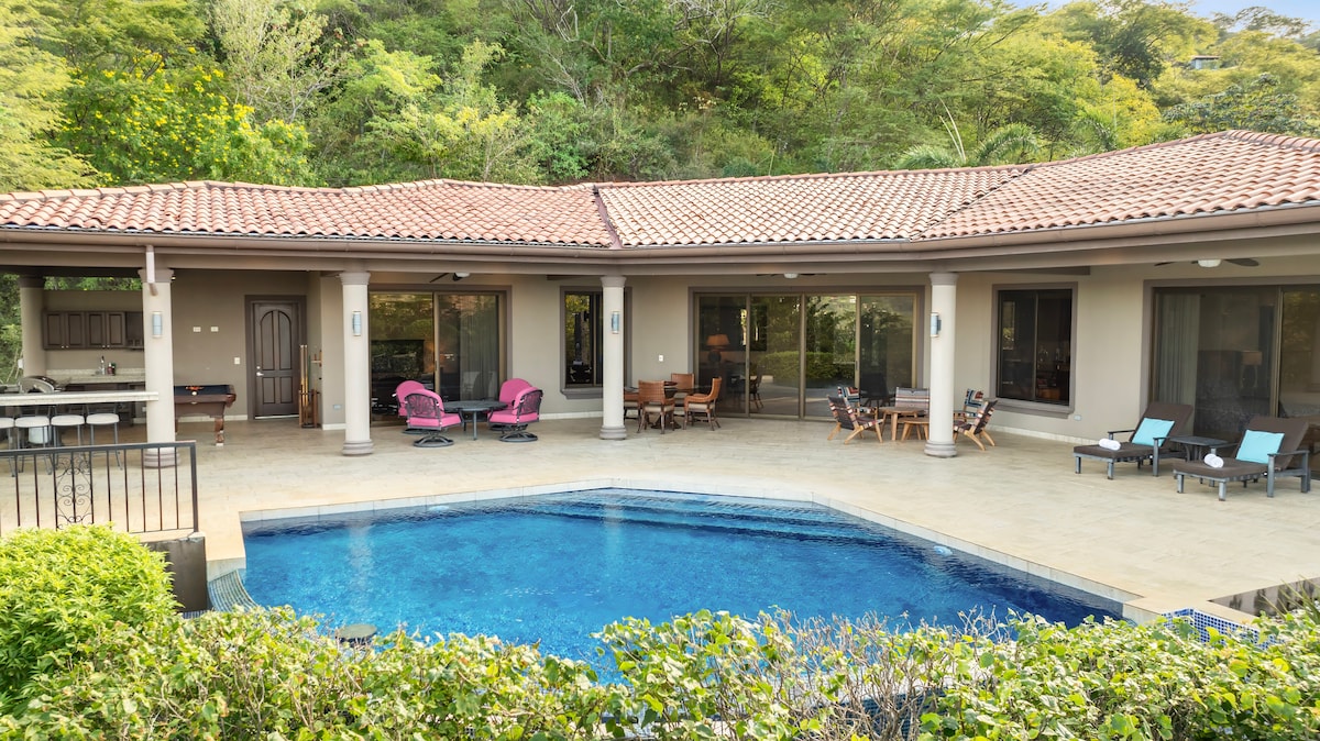 One of the best ocean and mountain views in Playas del Coco! We welcome everyone! Perfect for couples, families and remote workers. Fully equipped house, located at the top of a mountain inside a gated community, 10 minute walk to the beach. Grocery stores, restaurants and stores nearby. Short drive from Liberia Airport (20 min). Enjoy a concert of birds and monkeys every dusk and dawn, spectacular sunsets views of Playas del Coco. Close to nature, but not far away from commodities!
