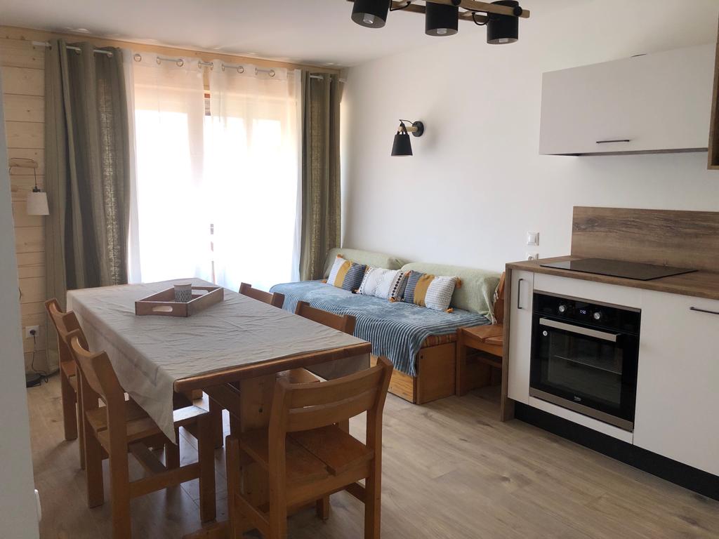 Apartamento de 2 habitaciones amueblado, cocina americana equipada con horno, microondas, raclette, cafetera, nevera, congelador, abierta a la sala de estar con sofá cama y televisión, equipo de música, balcón equipado con guardaesquís, inodoro independiente, un cuarto de baño con cabina de ducha, lavadora y secador de toallas, un dormitorio independiente, con literas y una cuna, opción para un bebé de tener una cuna.