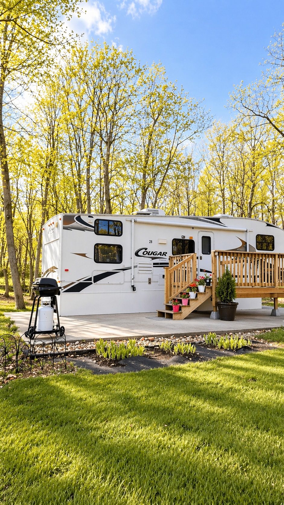Glamping with real comfort:cozy camper on top of Mad River Mtn,fully connected to on-site utilities. Enjoy reliable heat,hot water,strong Wi-Fi and a fully equipped kitchen. Enjoy coffee on the deck and explore the nature around you. Explore nearby: • Hiking trails and scenic walks • Horseback riding 5 min away • Ohio Caverns • Indian Lake • Charming Bellefontaine You’ll love: • Quiet setting • Two private bedrooms • Gated community Ideal for families or groups of four. Book your stay today!