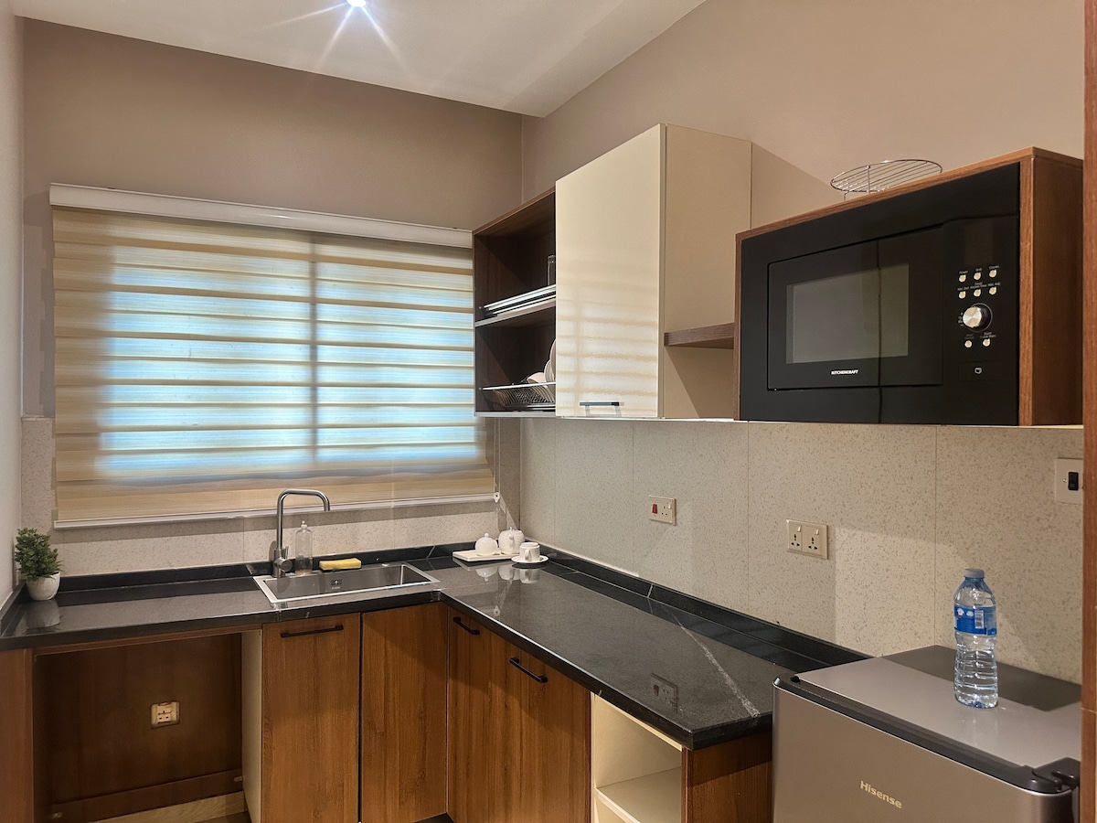 Amplia sala de estar y habitación real con cama tamaño king, baño moderno y aseo🚽. Apartamento muy limpio y estándar. Royal Pent House te ofrece todas las comodidades modernas más allá de tu imaginación con wifi de alta velocidad ilimitado, TV inteligente de 43 pulgadas en el dormitorio y TV inteligente de 55 pulgadas en la sala de estar, YouTube, Netflix, DSTV. Cómodo sofá, calentador de agua, hervidor de agua, microondas, gas para cocinar. Alarma de humo, alarma de dióxido de mono, energía 24/7. CCTV, máxima seguridad con personal de seguridad las 24 horas, 7 días a la semana.