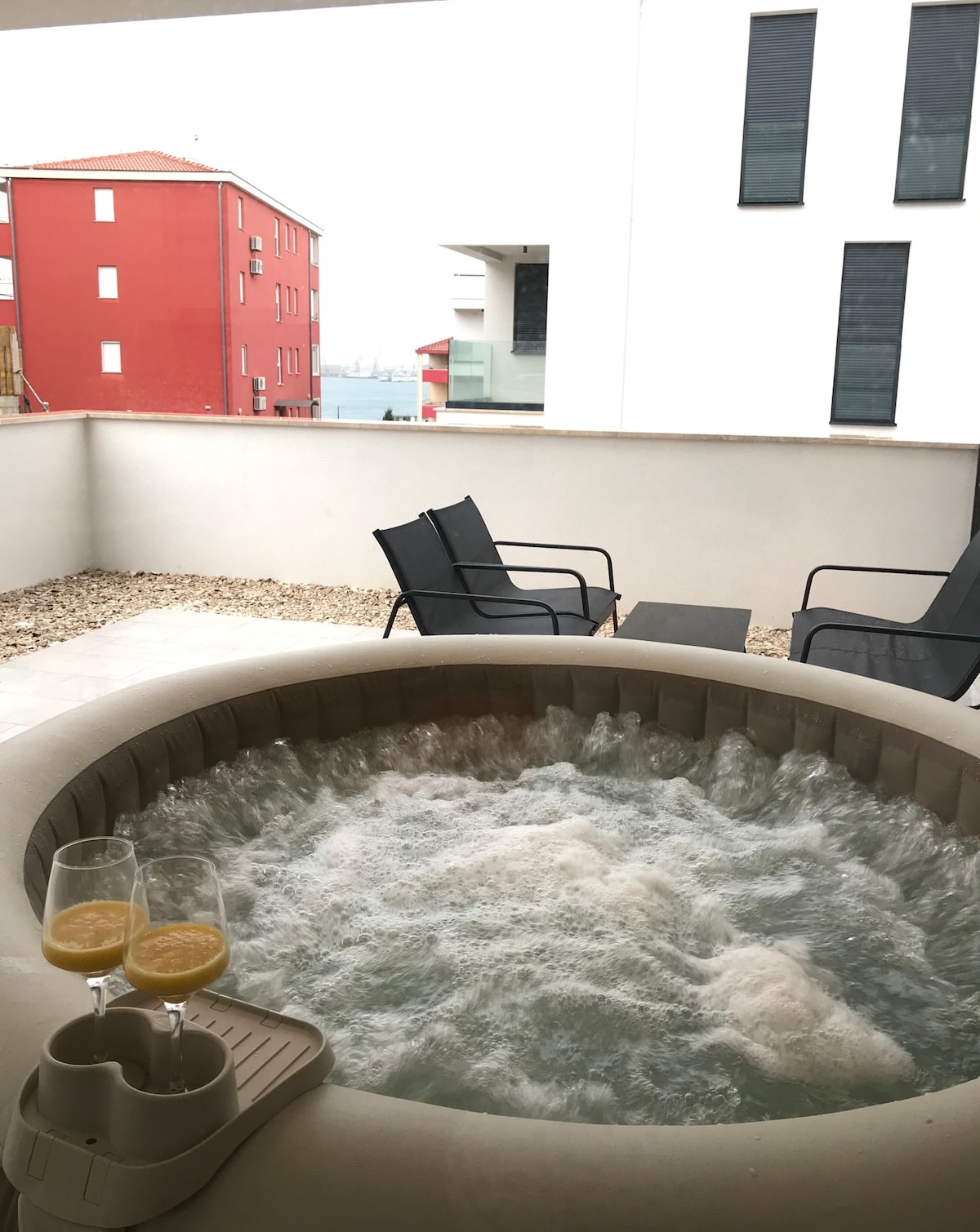 Ubicado en una zona tranquila de Okrug Gornji, este moderno departamento ofrece un total de 150 m² de espacio privado, terraza en la azotea con jacuzzi, ducha al aire libre, cocina de verano (con heladera), mesa de comedor y una gran cama con dosel con cortinas para descansar con estilo. Perfecto para parejas o familias que buscan una escapada privada al Mediterráneo. La terraza es totalmente privada, reservada solo para este departamento. Ideal para noches de relax bajo las estrellas, cenas al atardecer o una escapada romántica.