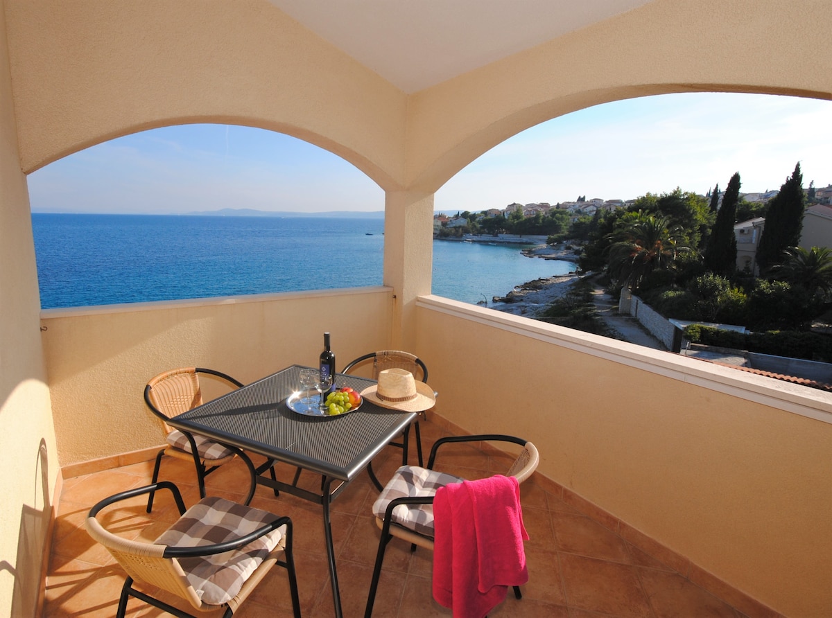 Relax on a terrace with a stunning panoramic sea view – the perfect spot for morning coffee or evening wine. Located in Okrug Gornji, just a short walk to the beach and about 1 km to shops and restaurants. Ideal for couples, friends or families looking for comfort, privacy, and breathtaking views - all just a short drive from historic Trogir.