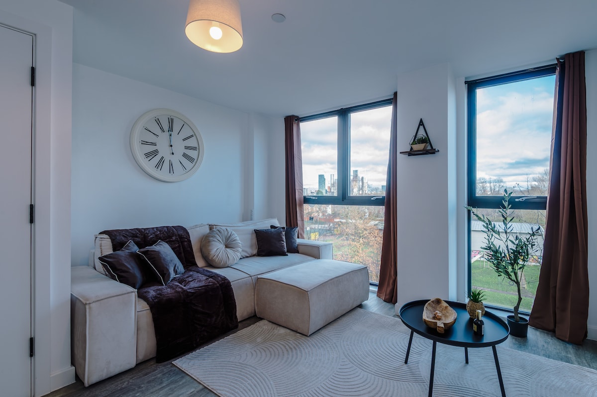Apartamento moderno con impresionantes vistas, cerca del tranvía y el estadio Manchester United. ¡Bienvenido a tu escapada ideal a Manchester! Este elegante y contemporáneo Airbnb está perfectamente situado en el corazón de Manchester, ofreciendo impresionantes vistas de la ciudad y fácil acceso a todo lo que la ciudad tiene para ofrecer. Situado a pocos minutos de la parada de tranvía, disfrutarás de un acceso perfecto a las vibrantes opciones gastronómicas, comerciales y de entretenimiento del centro de la ciudad, así como a Old Trafford, el emblemático hogar del Manchester United.