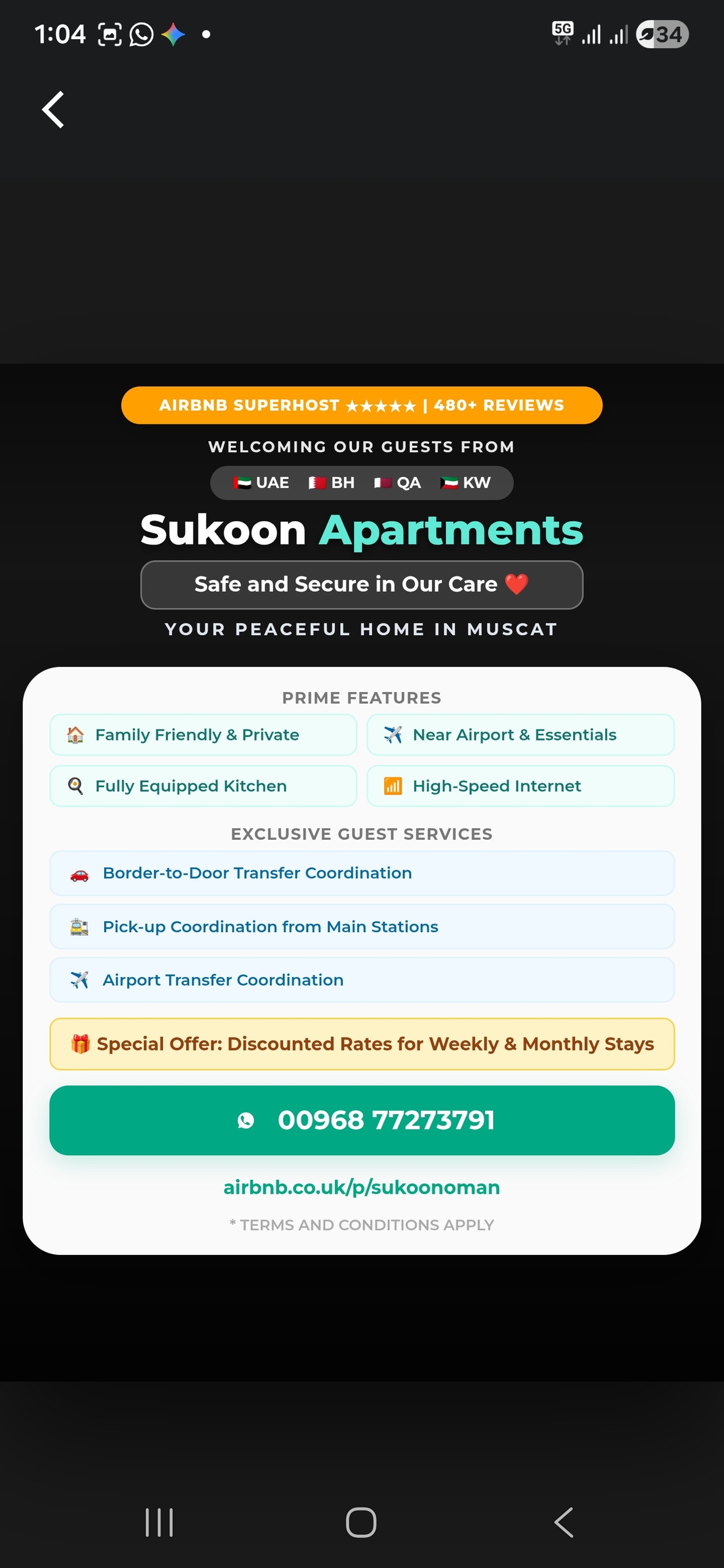 Sé el invitado en la casa de huéspedes de una pequeña familia en el corazón de Mascate. El acogedor estudio Guesthouse ofrece un ambiente tradicional con la hospitalidad de la familia. El estudio ofrece una cama tamaño king, un sofá cama en la sala de estar, una cocina con electrodomésticos completos y un baño privado. El anfitrión (Naseeb) ofrece excursiones personalizadas por todo Omán de norte a sur y de este a oeste y este. El anfitrión tiene más de 25 años de experiencia en el turismo de Omán. Sitio web: www.sunsandtours.com