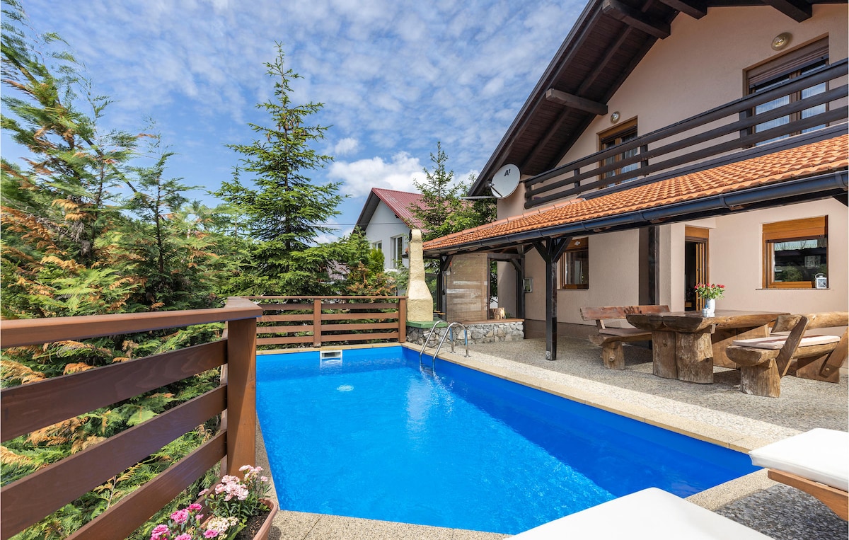 House Mountain Escape is located in the village of Slavica, 13 km from the town of Delnice and only 5 km from the municipality of Fužine. This region is known as Gorski Kotar, it is rich in forests, nature, and greenery. Gorski Kotar is a highland region in Croatia between Karlovac and Rijeka. This comfortable house with an indoor pool and sauna is surrounded by a beautiful green forest and wonderful nature. A place for rest and escape from everyday life and big city crowds.