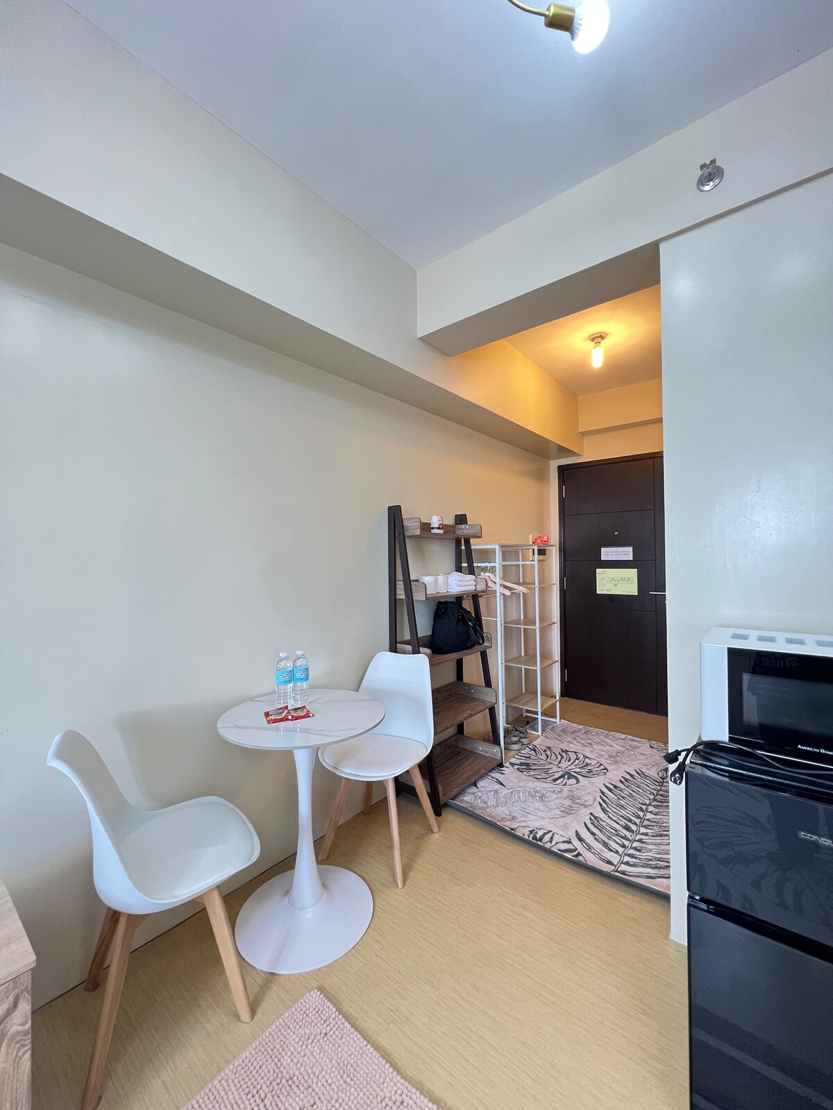 La unidad de apartamento está a poca distancia a pie de restaurantes, tiendas, un hospital y el centro comercial Ayala. El entorno es seguro. Hay seguridad las 24 horas y personal asignado en el vestíbulo. En el edificio hay ascensor. El interior de la unidad de estudio es acogedor y cómodo. Viene con 2 camas de matrimonio. Puede alojar hasta 3 huéspedes. Se proporciona conexión wifi a internet, ideal para llamadas por internet y navegar por la web.