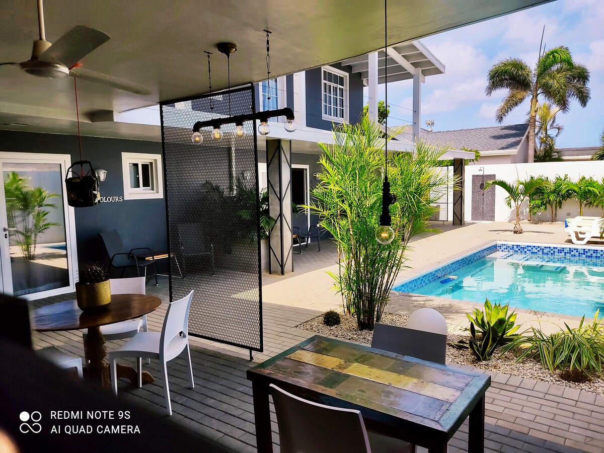 Escápese a nuestra villa mediterránea y disfrute de las arenas blancas de Aruba la isla feliz, hospédese en un apartamento de lujo con las mejores comodidades de un hogar caribeño, entrada desde el area del jardín, relájese en la piscina y disfrute de nuestro jardín tropical en el hamaca bajo las palmeras. UBICACIÓN PERFECTA *Palm Beach 400 mts a pie *Supermercado Noord 350 mts a pie *A solo 4 min manejando de restaurantes, discotecas y shopping. ~LOS NIÑOS SON BIENVENIDOS