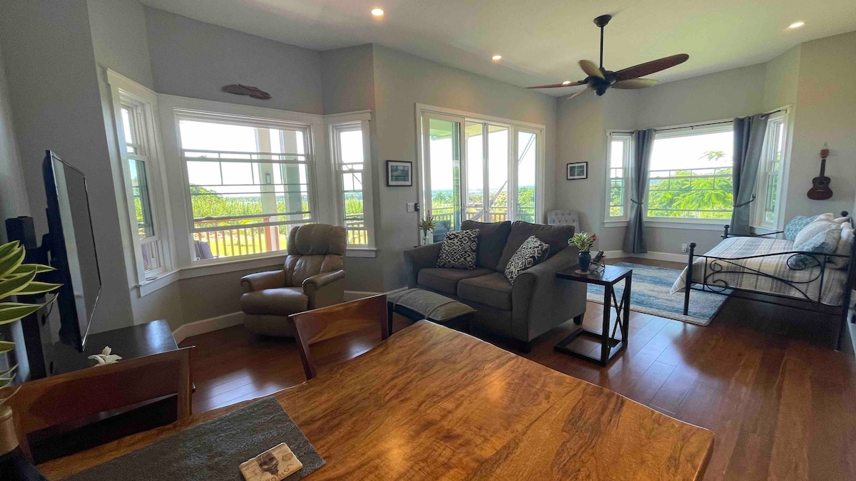 ¡Dormitorio enorme para 6 personas! ¡Respetuoso con el presupuesto! ¡Las palabras no pueden describir su belleza! ¡270 grados de ventanas! ¡Con vistas al océano! ¡No compartir paredes! Mucho espacio se suma a este ático privado como el segundo piso.Las comodidades incluyen cocina completa, Netflix, Internet rápido, escritorio, baño privado, nevera, sofá, hermoso patio, estanques koi, todo en un acre de tierra. Nuevo aire acondicionado. Baño privado. ¡Únete a nosotros!