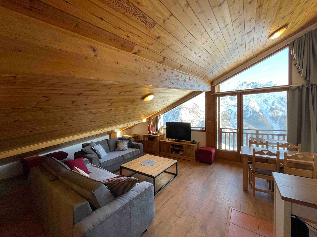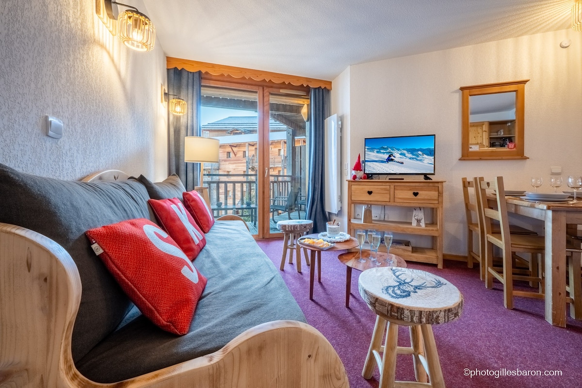 Hermoso apartamento orientado al sur para 6 personas tranquilo, residencia 3⭐️ Les Cristallines. Ascensores y estacionamiento privado cubierto. ¡Balcón panorámico en L con impresionantes vistas al valle! Cerca de tiendas y pistas. Sala de estar: cama nido, TV (TNT), WiFi gratuito. Dormitorio: 1 cama doble Cabina: 1 litera Zona de cocina totalmente equipada SDB con bañera, inodoro separado. Armario de esquís + garaje para bicicletas seguro. ¡Todo para una estancia inolvidable en la montaña en familia o entre amigos! 👍🦫🌲🌻