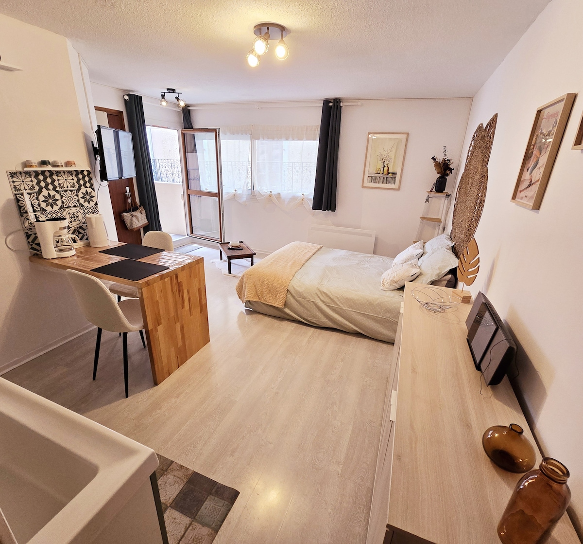 A 50 m des Halles et 200 m des thermes. Appartement traversant comprenant un séjour cuisine avec coin repas, deux chambres dont une avec lit double, l'autre avec lit mezzanine et clic-clac, une salle d’eau, des WC séparés, ainsi qu’une terrasse . L’appartement offre de nombreux rangements et tout le confort nécessaire : TV connectée, Wi-Fi, lave-vaisselle, draps et serviettes de bain compris. La maison dispose également d’un local pour vélos et skis avec douche à vélo et séchoir à chaussures.