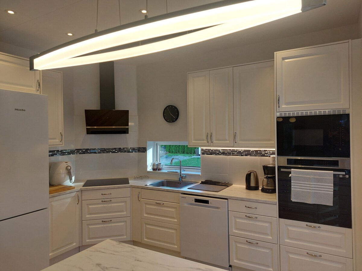 Nyrenoverad lägenhet på 65 kvm med utrymme för upp till 6 personer. Här finns bekväm 160-säng och bäddsoffa, samt tillägg av 2 ytterligare 80-sängar utifrån önskemål. Lummig utomhusmiljö och lantlig skandinavisk inredning med träpanel från golv till tak. Rofylld färgsättning med fullt utrustat kök, tvättmaskin och torktumlare. Gångavstånd till skog, 10-15 min bil till stan, 7 min till sjö, golfbana och gym. I trädgården finns sommartid uteplats, studsmattor, fotbollsplan, bär- och fruktträd.