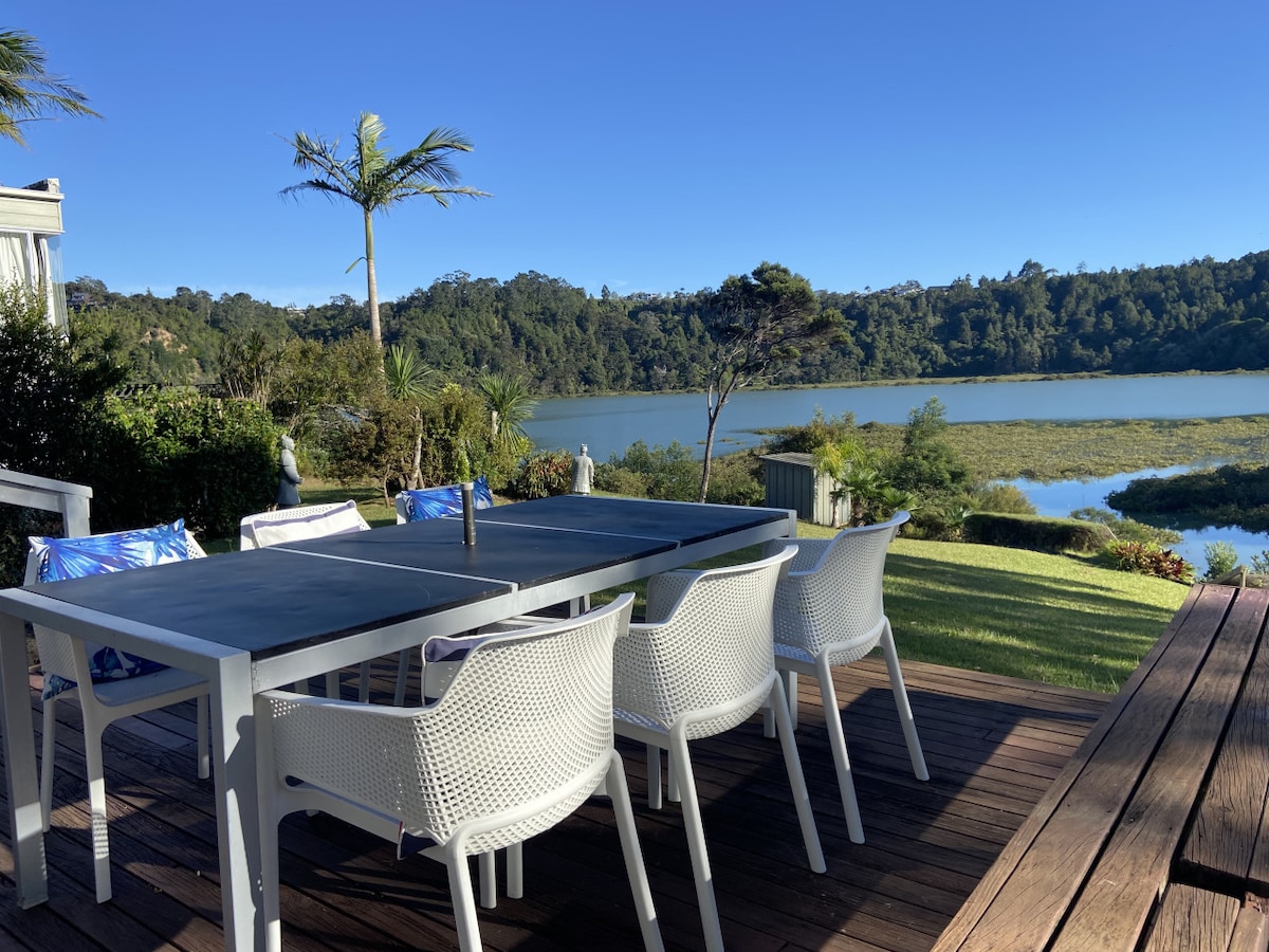 An idyllic country retreat on the edge of a secluded lake just 35 minutes from Auckland. With 3 bedrooms, generous living flowing onto amazing decks, and a gorgeous tree-lined setting it’s the place to recharge batteries for up to 8 special friends. Kids will love meeting horses or kayaking 🚣🏻♂️ (1 double & 1 single) and fishing 🎣 on the lake. Your furry friends 🐕 are also welcomed here!